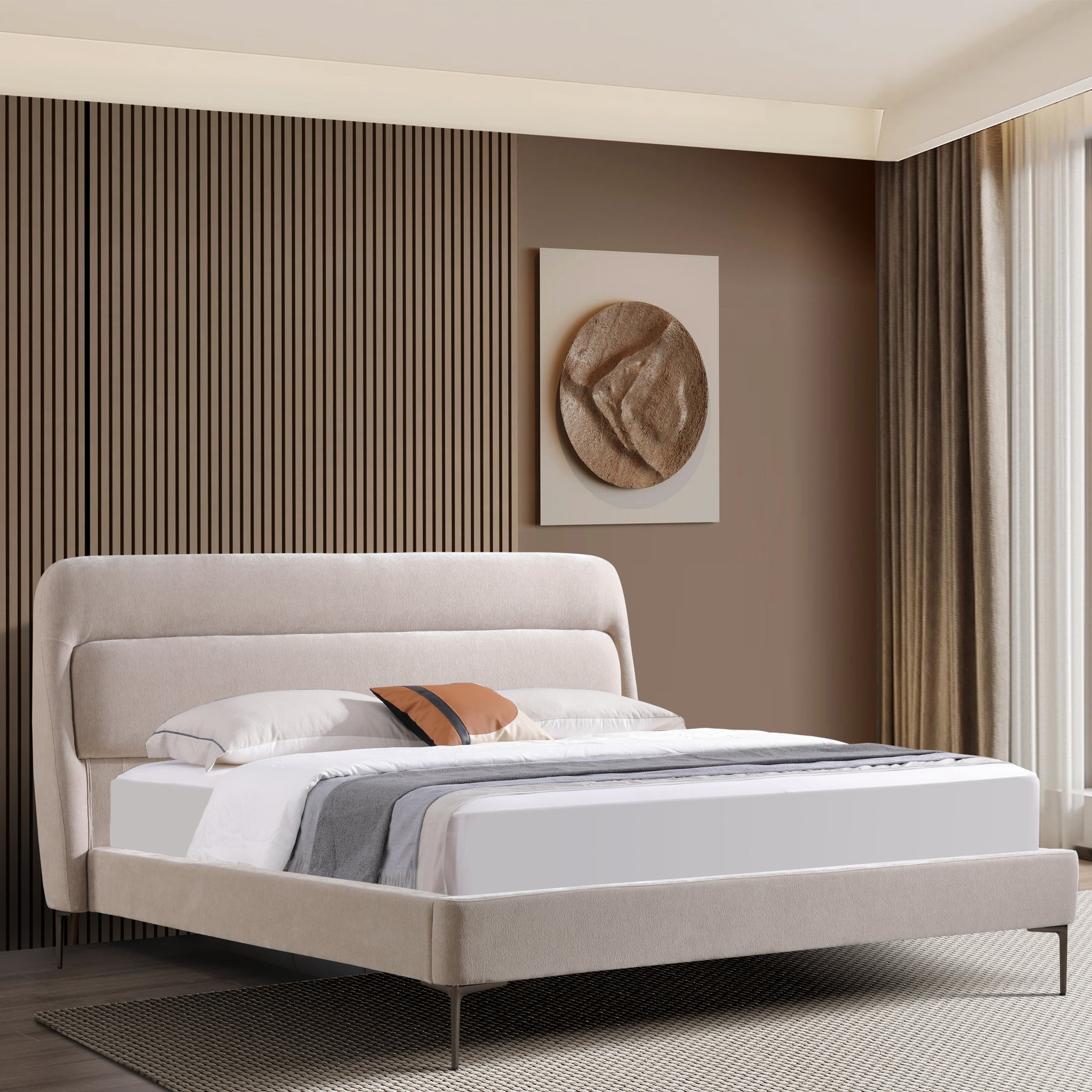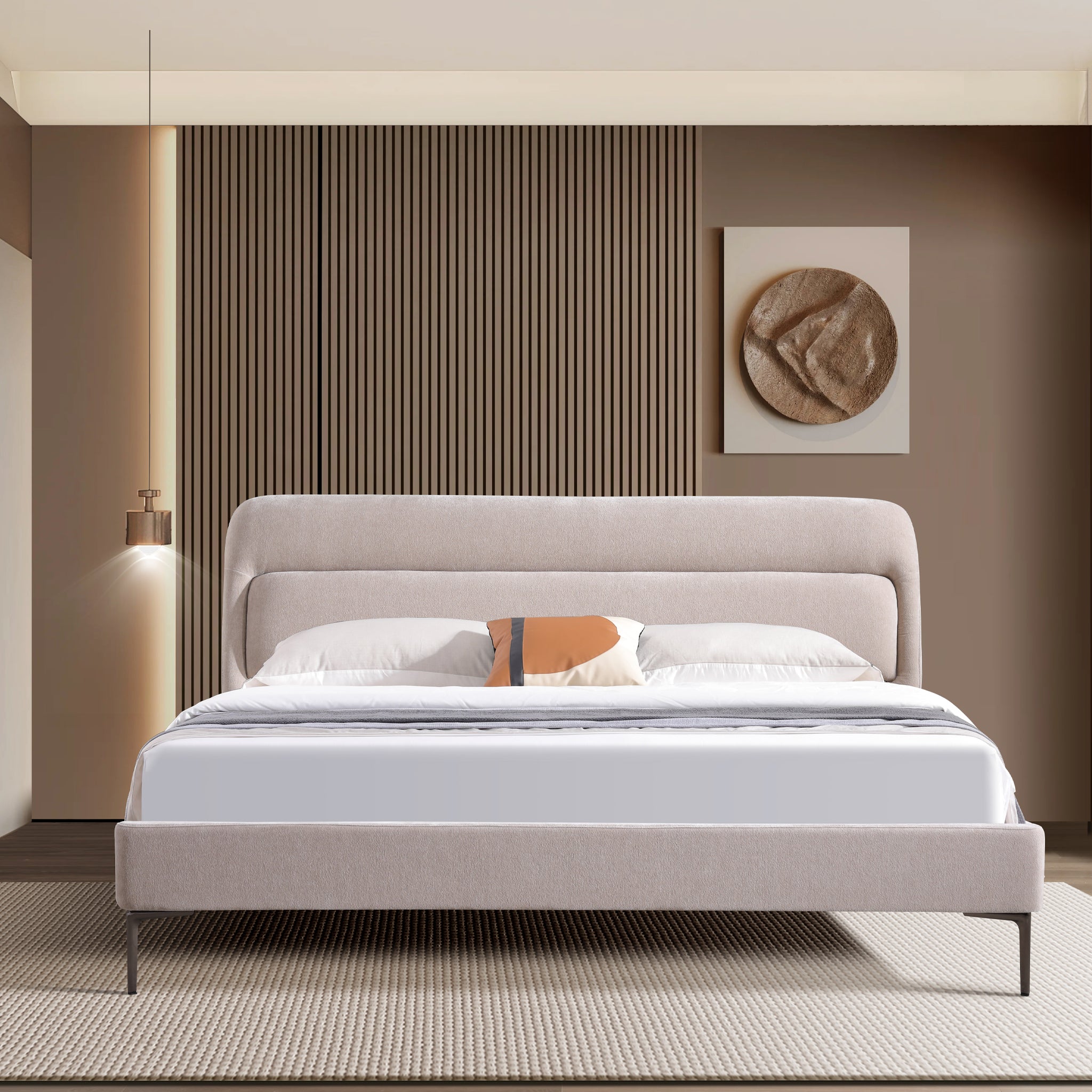 أجواء أنيقة يقدمها سرير قماشي بروح عصري تمنحك راحة لا مثيل لها. مصنوع من مخمل، خشبي ليجمع بين المتانة والأناقة. يمنحك تجربة نوم هانئة تناسب الباحثين عن سرير فاخر يتميز هذا التصميم بدمج الخامات المتينة مع تفاصيل أنيقة ليمنحك تجربة نوم متكاملة بتصميم عصري يمنح غرفتك مظهراً متوازناً يجمع بين العملية والجمال.