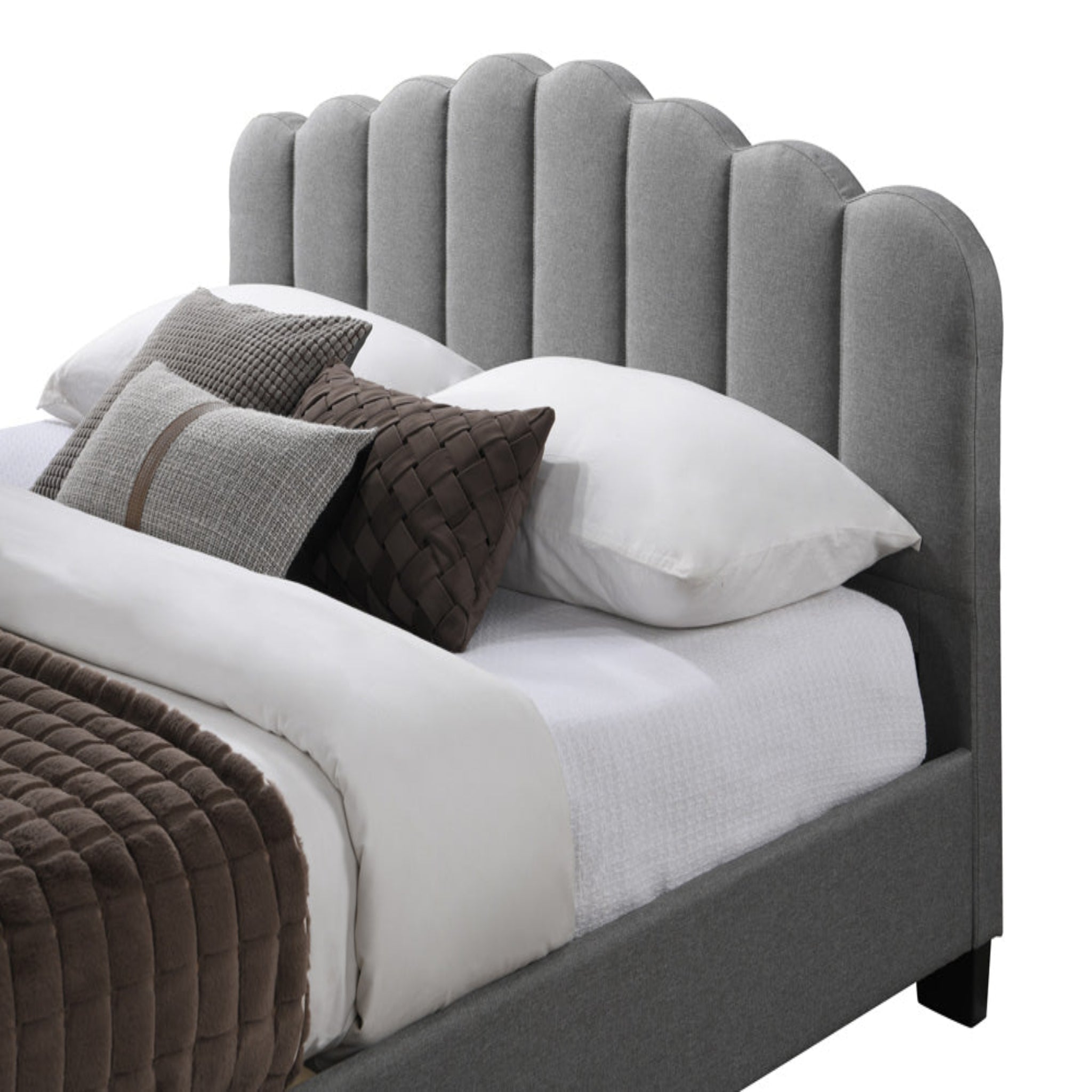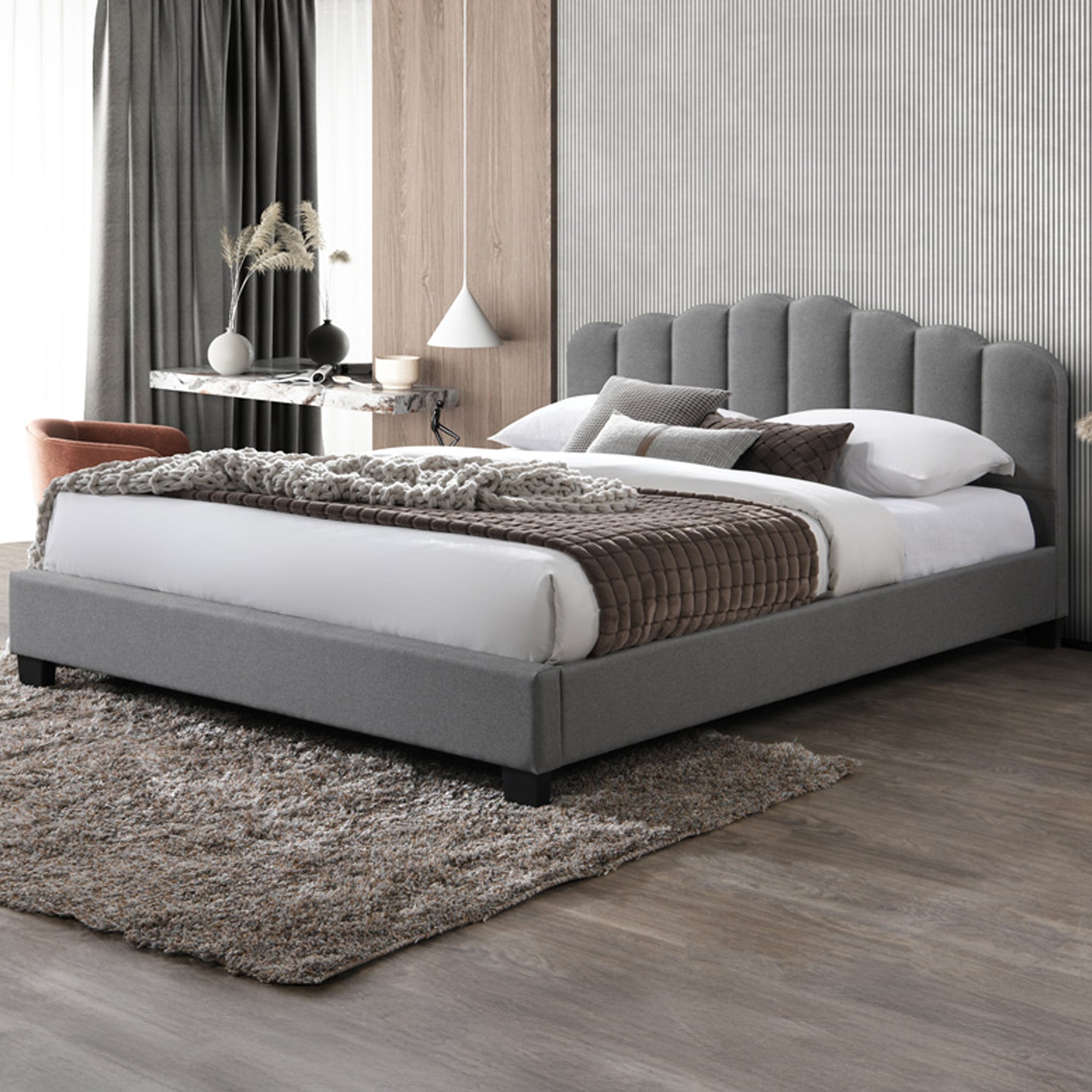 سرير بتصميم أنيق ومبطّن بلون رمادي فاتح هادئ، يتميز بلوح خلفي يغطّي كامل الواجهة الخلفية ويمتد حتى الأرض، ليعطي مظهر مرتب وفخم يناسب غرف النوم الحديثة.