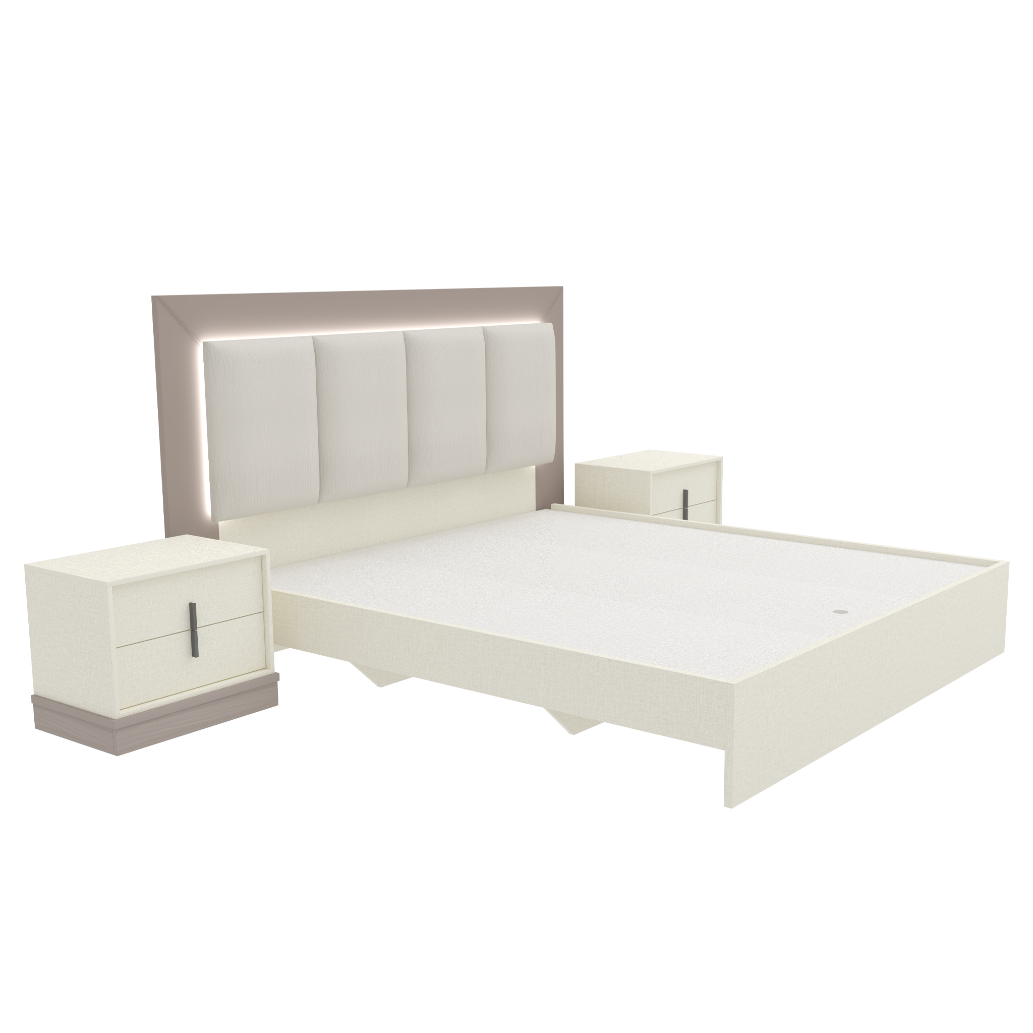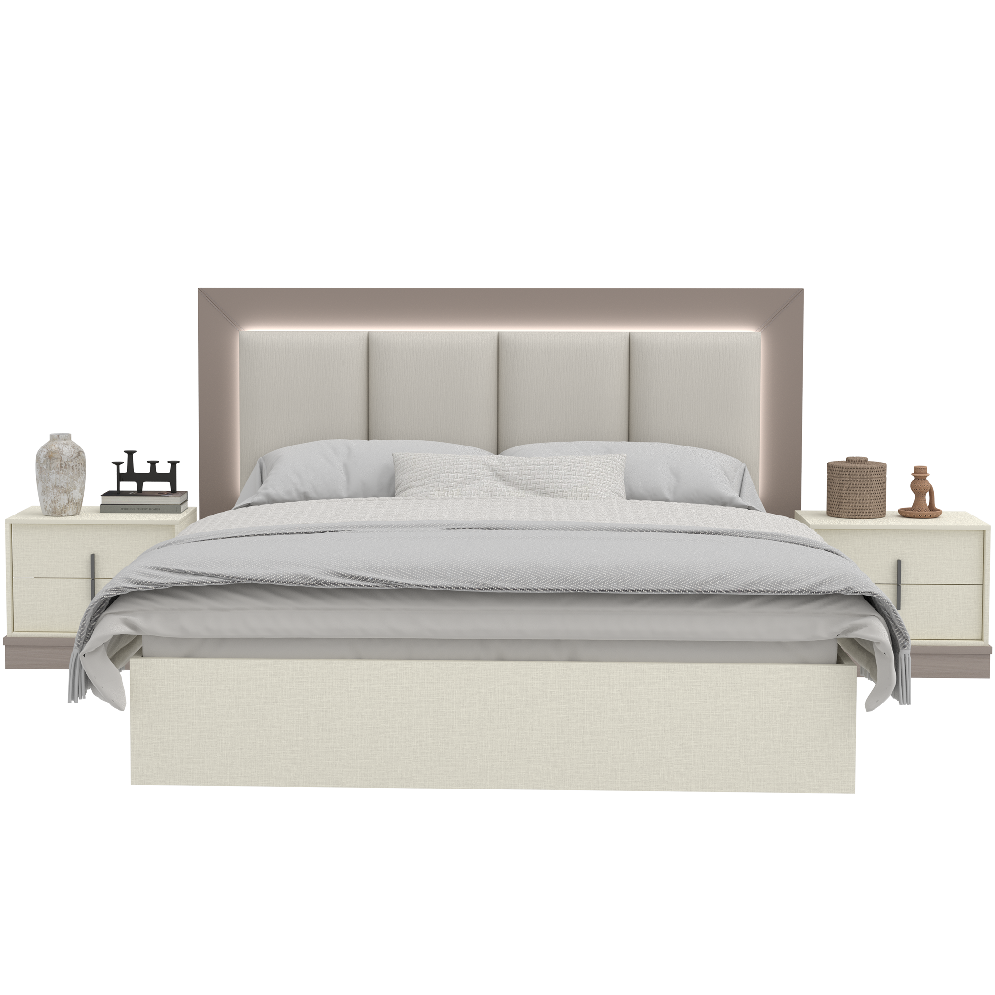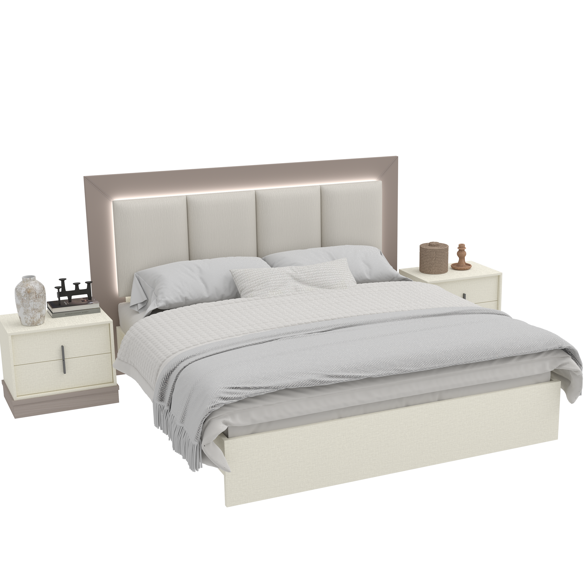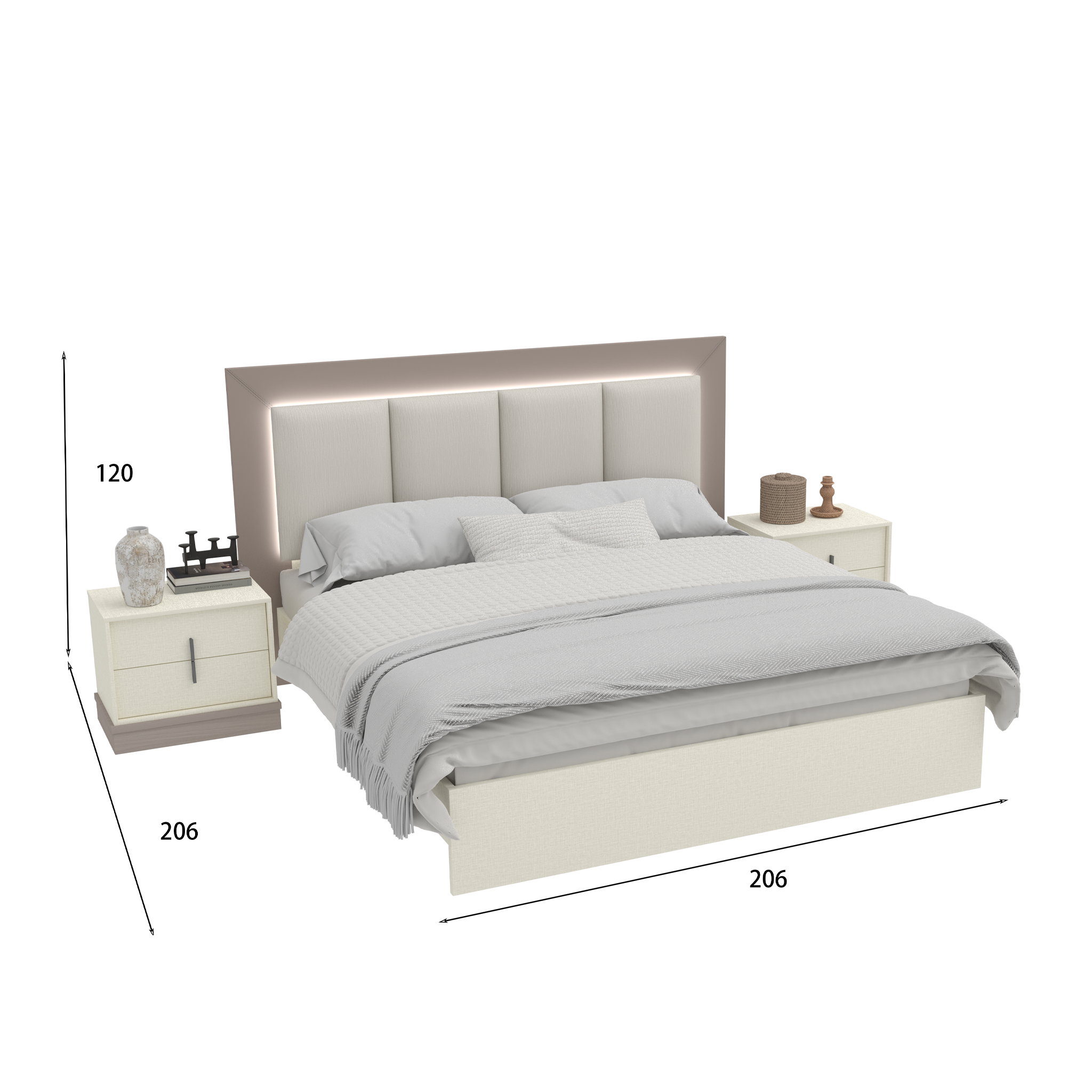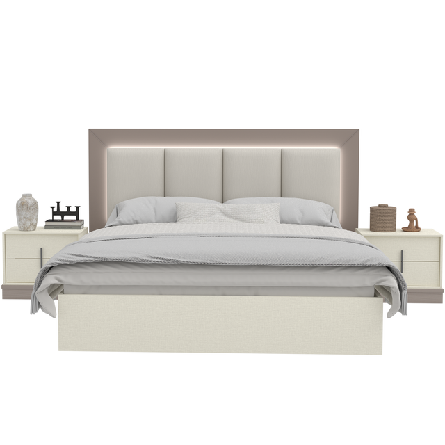 سرير واسع بتصميم أنيق يجمع بين هيكل الملامين المتين ولوحة خلفية مكسوّة بالقماش لتعطي لمسة دفء ورقي.