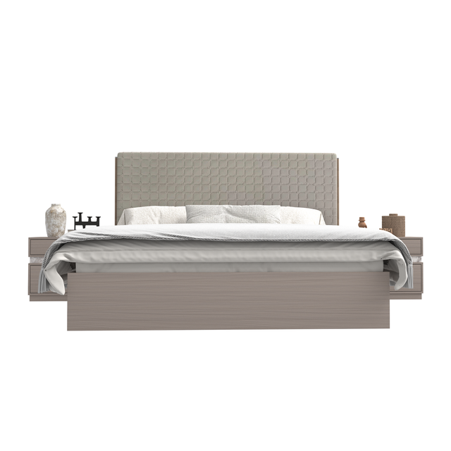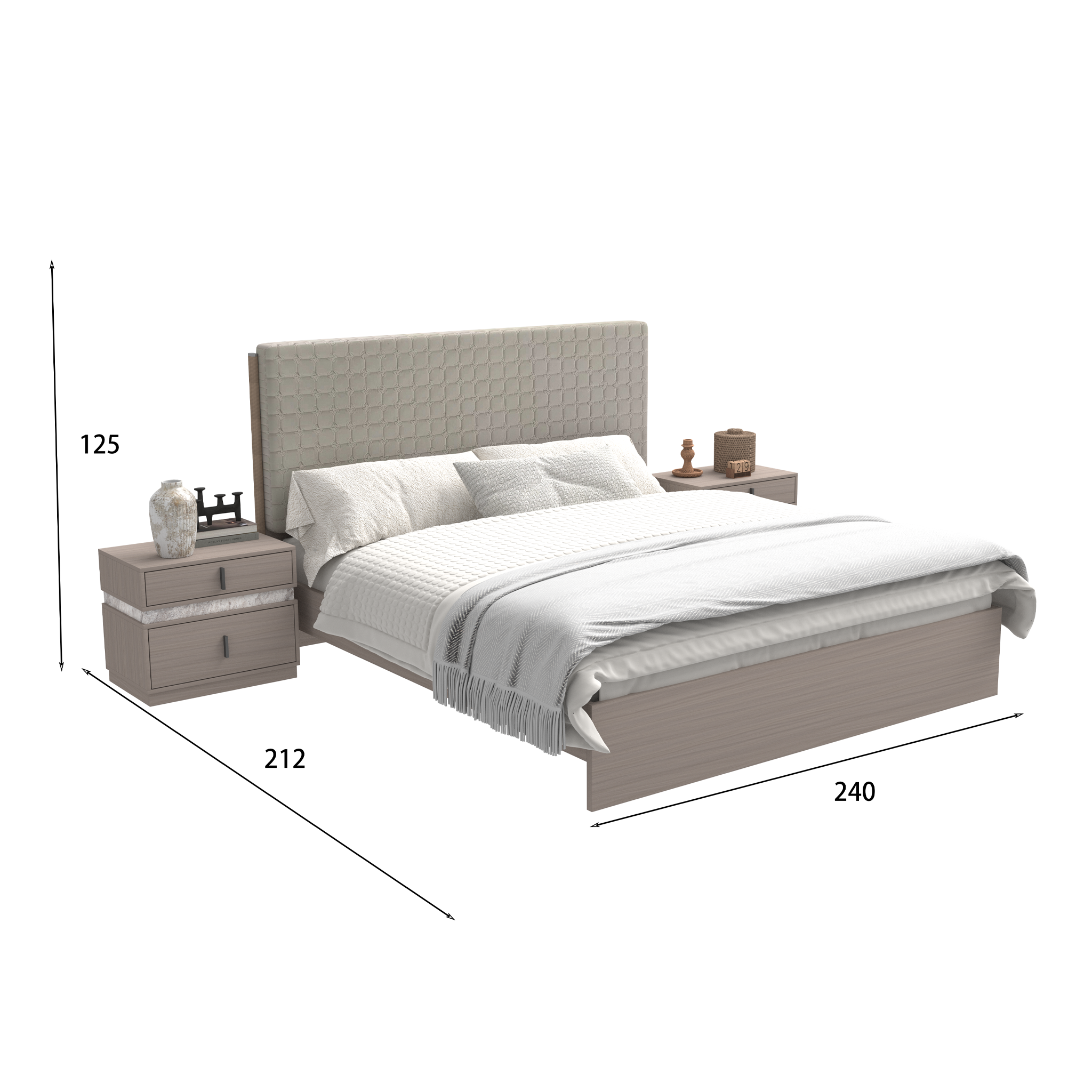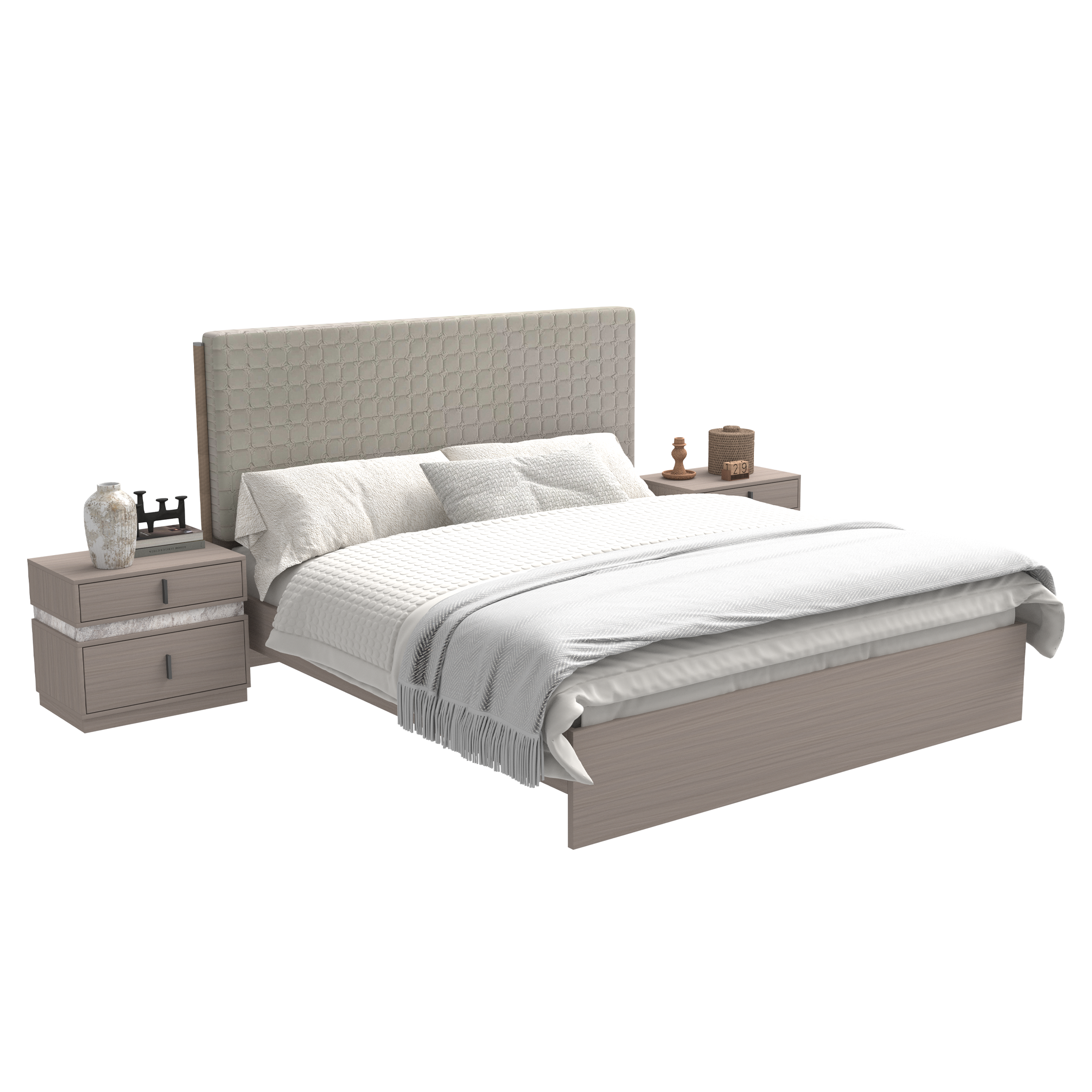 سرير واسع بتصميم هادئ يجمع بين اللوح الخلفي المكسوّ بالقماش وهيكل الملامين المتين.