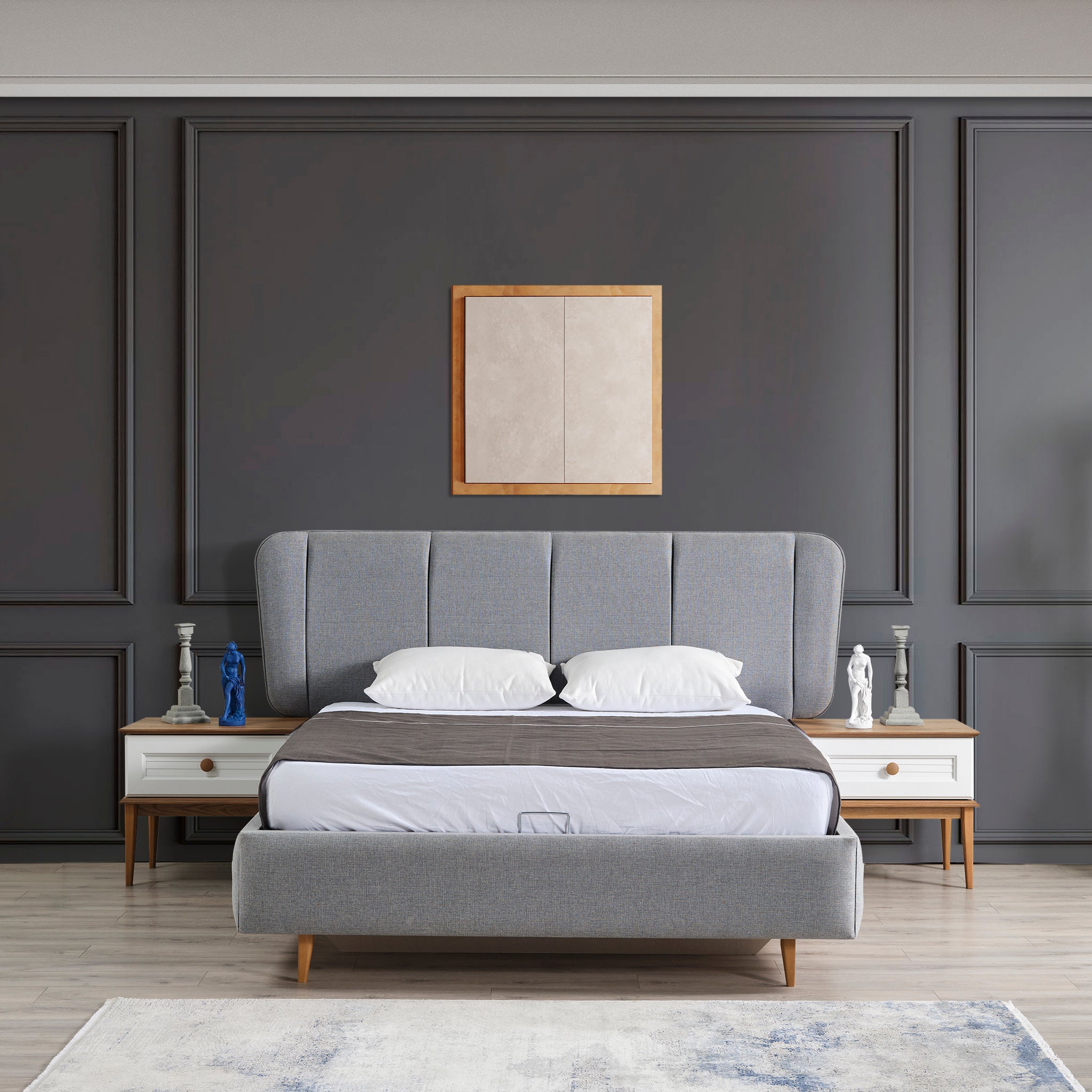 سرير بتصميم عصري وأنيق باللون الرمادي والخشبي، يتميّز بإطار خشبي قوي، يوفّر دعمًا ممتازًا للمرتبة لضمان راحة نوم استثنائية.