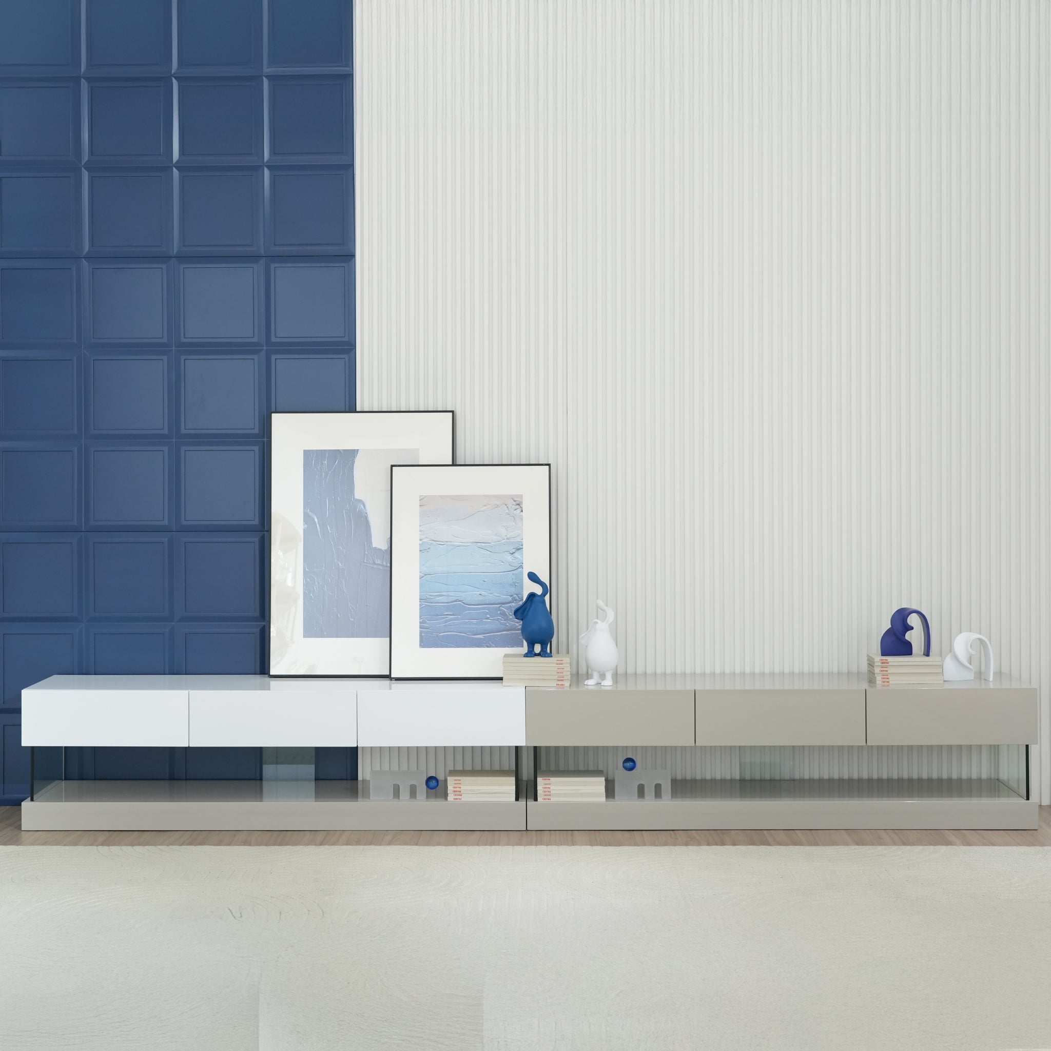 وحدة تلفاز تجمع بين البساطة والفخامة، بتصميم أبيض لامع يبرز جمال التفاصيل ويعطي الغرفة طابعًا أنيقًا ومنظمًا. صُنعت من خشب متين بتشطيب عالي الجودة وسطح زجاجي شفاف يمنح لمسة من الحداثة. تحتوي على أدراج بإغلاق ناعم لحفظ الأجهزة والإكسسوارات بشكل أنيق، مع خطوط نظيفة تضيف إحساسًا بالانسيابية. قطعة عملية تعكس ذوقًا راقيًا وتكمّل مظهر غرفة المعيشة العصرية.