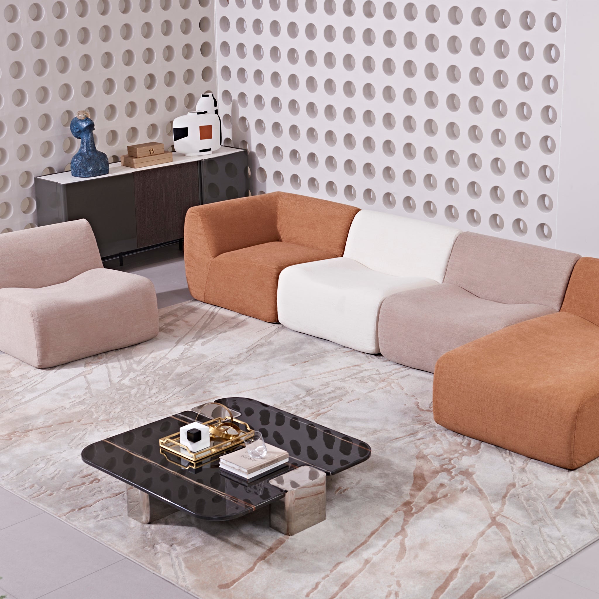 مصنوعة من قماش المخمل الناعم، تمنحك تجربة جلوس مترفة وملمس مخملي جذّاب. تصميمها المكون من وحدات متعددة يمنحك حرية الترتيب حسب المساحة والذوق.