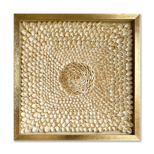 لوحة فنية بتصميم دائري متدرّج مستوحى من تكرار العناصر الطبيعية بانسيابية متناغمة، حيث تتوزع التفاصيل بدقة حول المركز لتكوّن تكوينًا بصريًا جذابًا يمنح الجدار عمقًا وحيوية. يعكس اللون العاجي مع اللمسات الذهبية إحساسًا بالهدوء والفخامة في آنٍ واحد، ما يجعلها قطعة لافتة بأسلوب راقٍ ومتوازن.