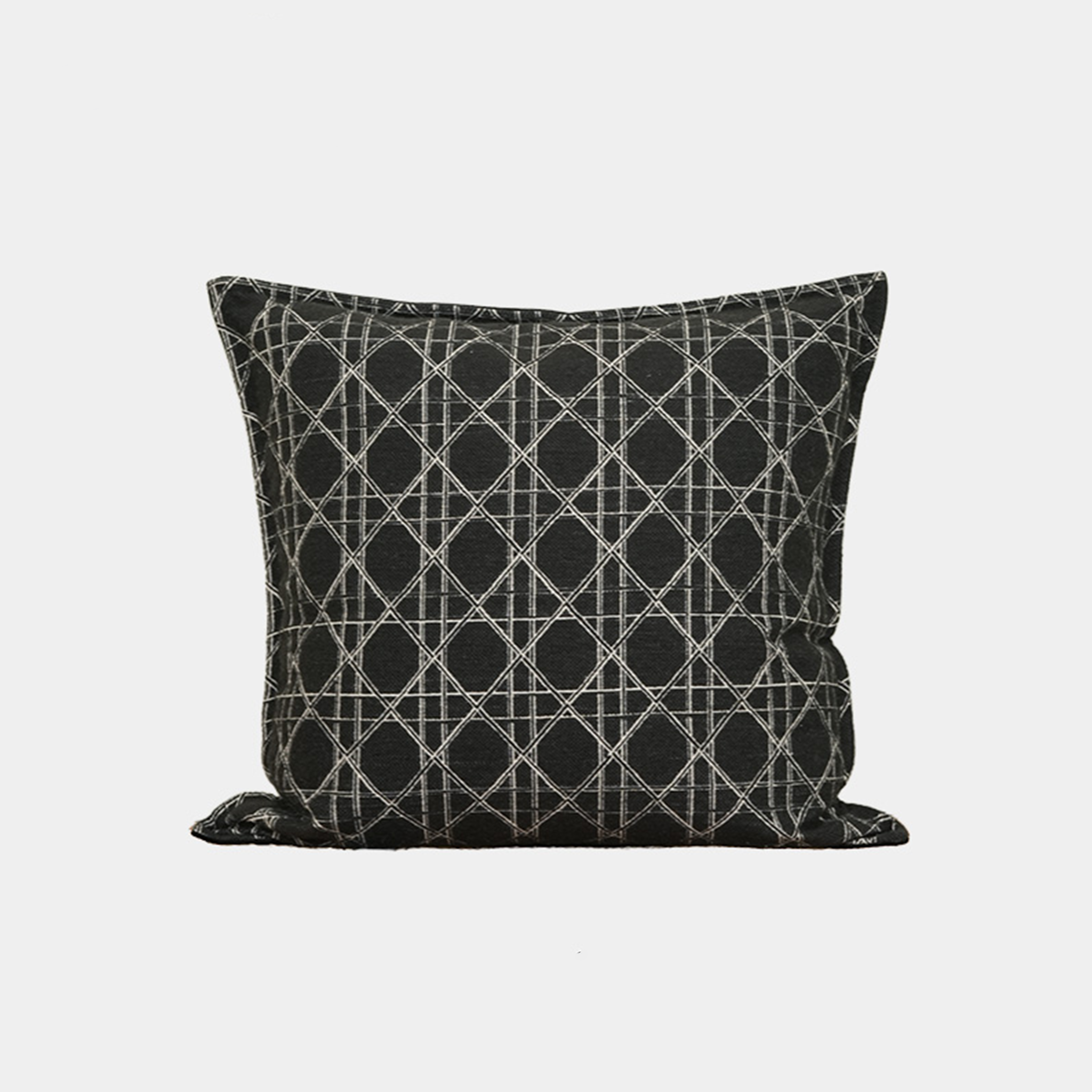 غطاء مخدة بطابع راقي ونقوش فاخرة باللون الأسود وبخطوط هندسية باللون البيج مصنوعة من خامات عالية الجودة لتدوم طويلًا.