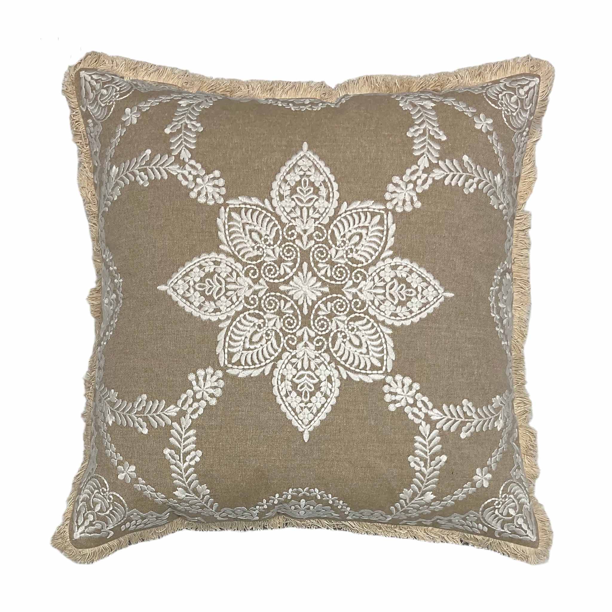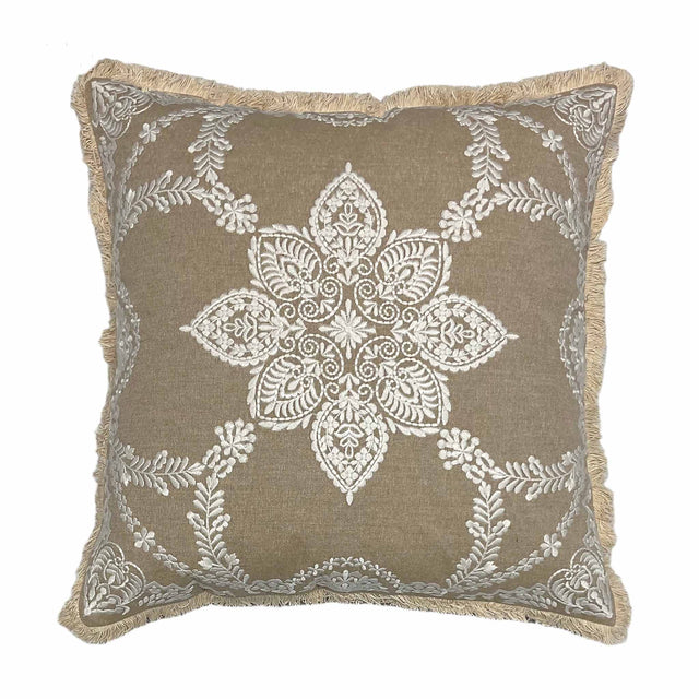 وسادة ديكور تتميز بتفاصيل دقيقة تمنحها طابعًا فنيًا واضحًا داخل المساحة. تعتمد على قماش وسادة مطرزة مع دانتيل قطني مهدب عالي الجودة الذي يجمع بين النعومة والثبات. تساعد في إبراز تناسق الكنب وإضفاء عمق بصري على المساحة.
