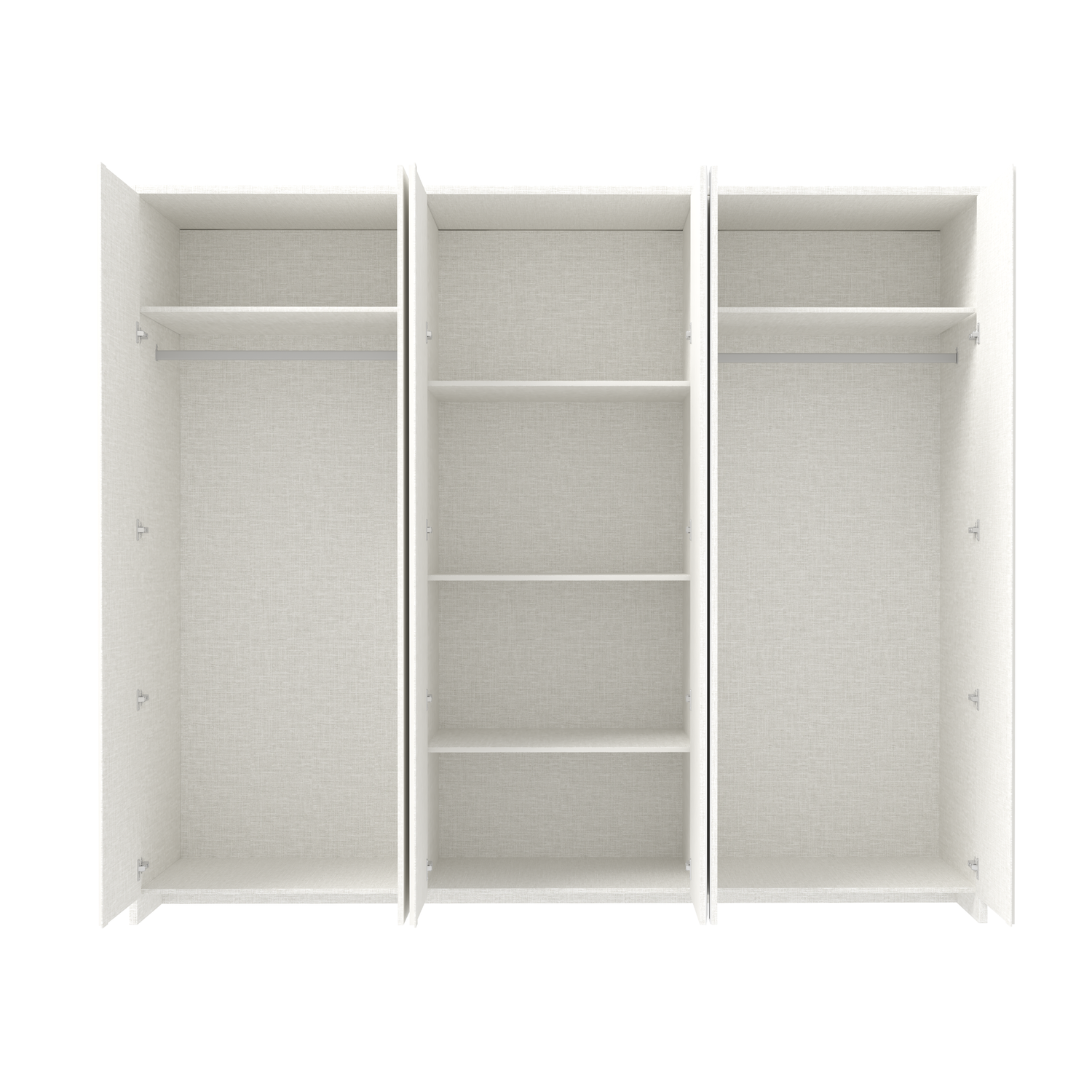 دولاب ملابس مودرن مع مرايا مدمجة ليمنح الغرفة مظهراً أوسع. مصنوع من خشب متين ويحتوي على مساحة واسعة لتعليق الملابس وتخزينها بترتيب. تصميمه الأنيق يجعله خياراً عملياً لغرف النوم الكامل