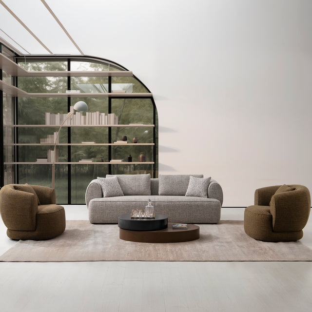طقم كنب عصري متكامل يجمع بين الراحة والجمال العملي بتصميم أنيق يناسب مختلف المساحات. صُنع من قماش بنسيج يشبه الكتان يمنح ملمساً طبيعياً ناعماً ولمسة دافئة تضفي جواً من الأناقة الهادئة على غرفة المعيشة.