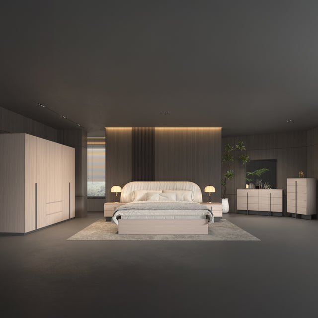 تجتمع الأناقة مع الراحة في غرف النوم بتصميم لارويفا، الذي يعكس أسلوب غرفة نوم مودرن أنيق وعملي. صُممت الغرفة بلون الرمادي الجوزي مع لمسات قماش أبيض فاخر، وأضيفت إليها مقابض مطفية باللون الأسود لتمنحك شعوراً بالفخامة والتميز. كل قطعة من هذه المجموعة تعكس مفهوم تصاميم غرف نوم راقية تناسب أجواء غرفة نوم رئيسية أو حتى غرف نوم للبنات بلمسة عصرية.