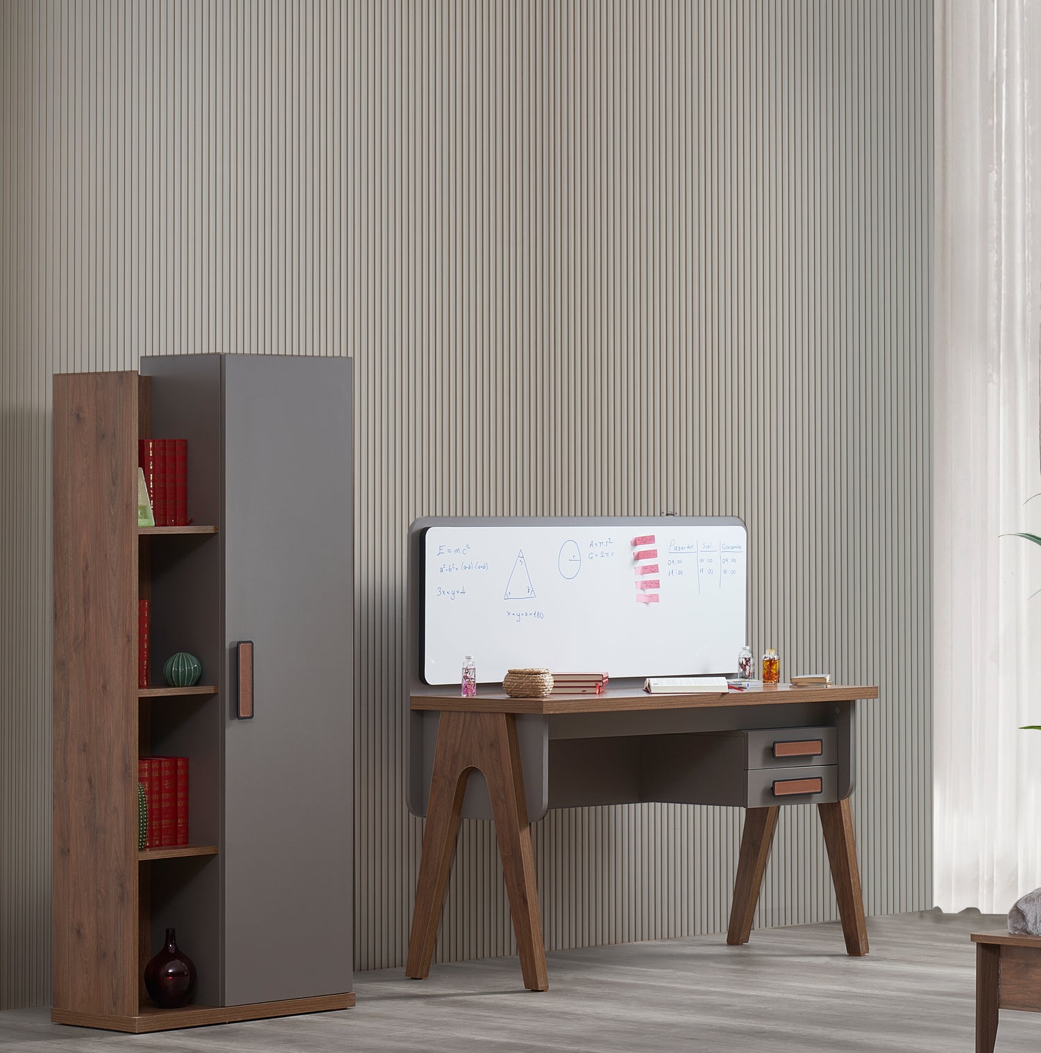 غرفة أطفال متكاملة وعصرية تجمع بين التصميم العملي والجمالية الهادئة، مصممة لتلبية احتياجات الأطفال اليومية مع توفير أجواء مريحة ومرتبة. تتميز الغرفة بخامات عالية الجودة من خشب قوي ومتين مع تفاصيل تصميم أنيقة بلون أمالفي جرانيت الهادئ، ما يجعلها خيارًا مثاليًا لغرفة نوم تنمو مع طفلك.