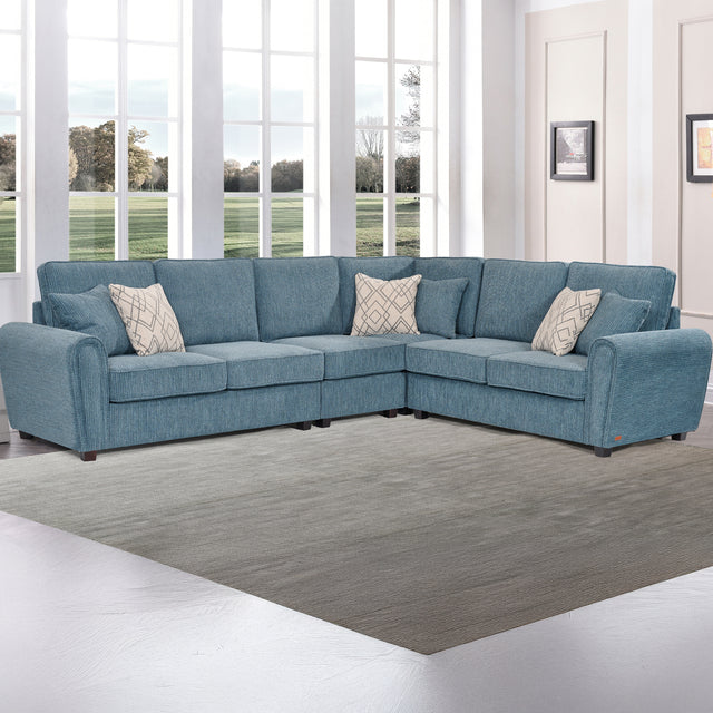 طقم شكل زاوية عصري يجمع بين الراحة والأناقة، مكون من كنبة ركنية متعددة المقاعد مع كرسي إضافي.