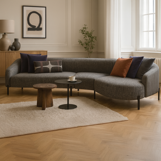 كنب هارلين زاوية باللون الرمادي أنيق وفاخر يضيف لمسة من الراحة والأناقة على منزلك. مصمم بتصميم عصري يجمع بين الراحة والمتانة، مع قماش ناعم ومتين يوفر لك تجربة استرخاء مريحة