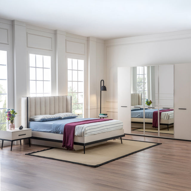 غرفة نوم كاملة مكونة من 4 قطع، تتميز بتصميم عصري أنيق يناسب كافة الأذواق. تحتوي على سرير مريح، دولاب لتخزين ملابسك، وتسريحة مع مراية، بالإضافة إلى طاولات جانبية. تتميز بالألوان المحايدة التي تتناسب مع أي ديكور وتوفر الراحة والعملية.