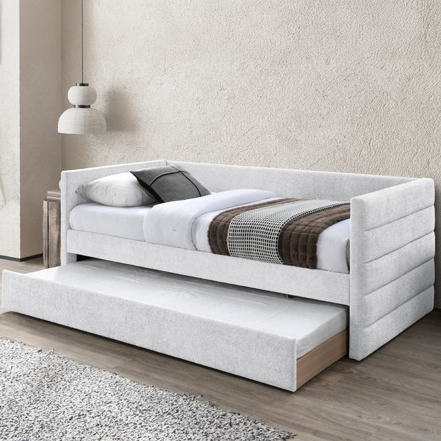 سرير عملي بتصميم مريح وبلون ناعم وأنيق، يأتي بمقاس مفرد ويتميّز بوجود سرير سحب سفلي مثالي لاستضافة الضيوف أو توفير سرير إضافي للأطفال بطريقة ذكية لا تأخذ مساحة إضافية.