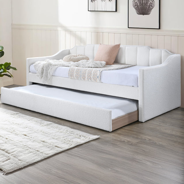 سرير مفرد أنيق بلون كريمي ناعم، مزوّد بسرير سحب سفلي عملي يُستخدم كمكان نوم إضافي وقت الحاجة.