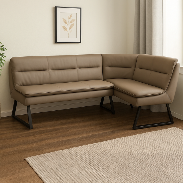 كنب زاوية فاخر بتصميم عصري أنيق يضيف لمسة من الفخامة والتميز إلى أي مساحة معيشة. صُنع من جلد صناعي رمادي عالي الجودة يتميز بملمسه الناعم ومظهره اللامع الذي يجمع بين الفخامة وسهولة التنظيف.