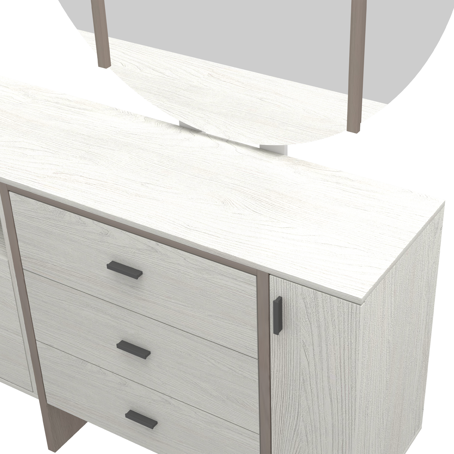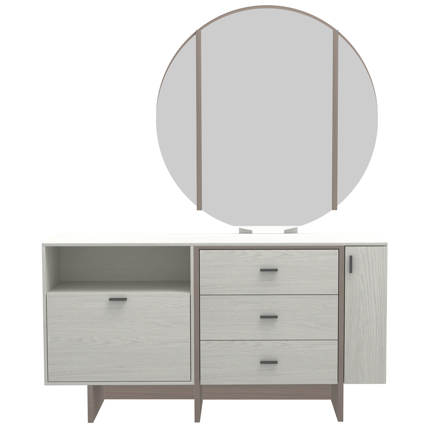 تسريحة غرفة نوم كبيرة بسطح عملي وأدراج واسعة لحفظ المستلزمات. تأتي مع مرآة أنيقة تعكس جمال الغرفة، مما يجعلها مثالية كـ تسريحة كبيرة أو تسريحة بإدراج وسيعة تناسب استخدامك اليومي.