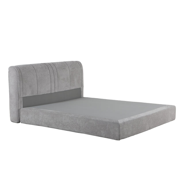 سرير بتصميم عصري باللون الرمادي، مزود بقاعدة متينة، ومسند رأس مرتفعة لإحساس مريح وأنيق بطابع فاخر ومختلف بخشب عالي الجودة.