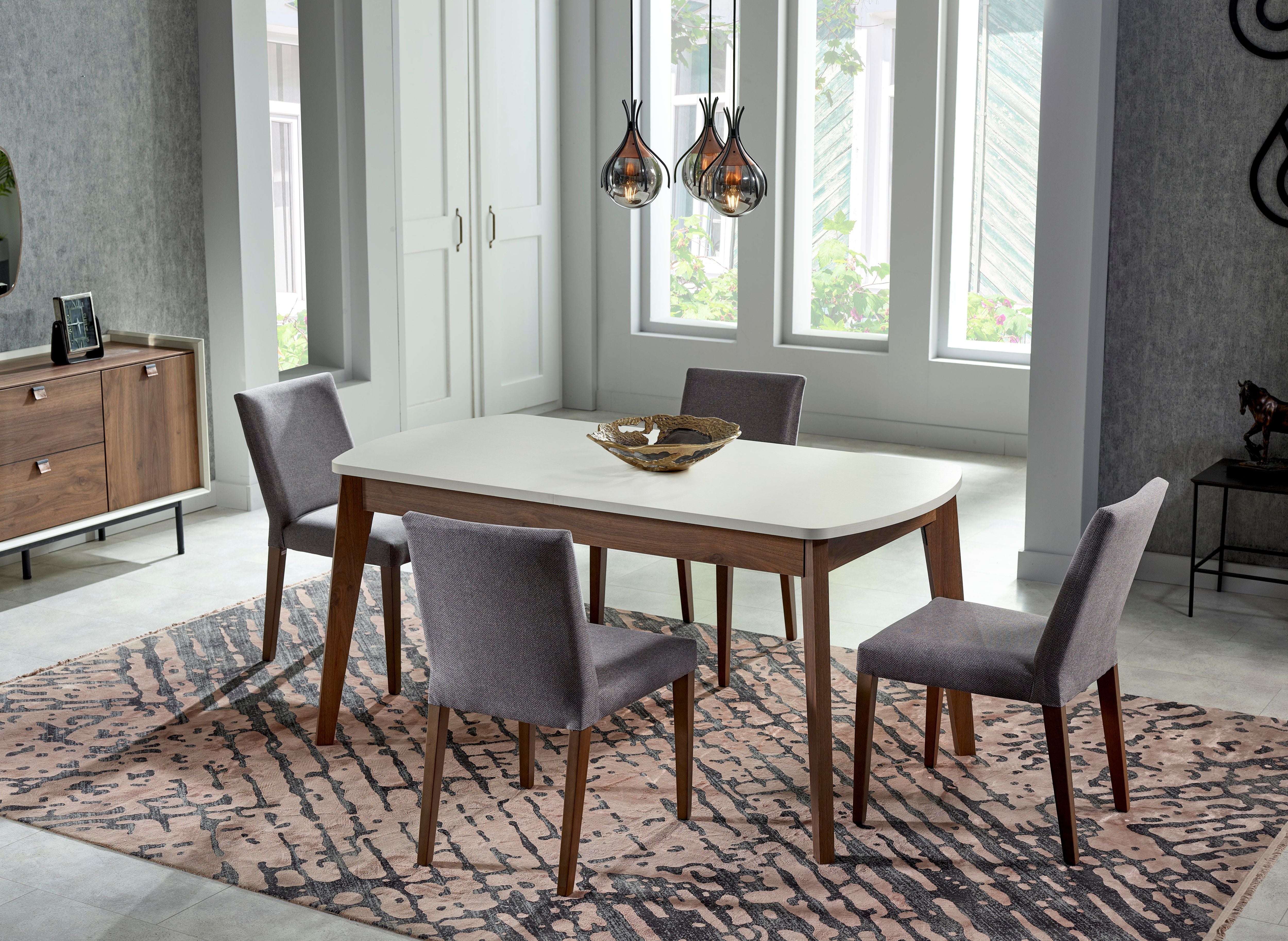 طاولة طعام بتصميم عصري يجمع بين البساطة والأناقة، تتميز بسطح علوي بلون فاتح يضفي إشراقة على المساحة، مع قاعدة خشبية دافئة تعكس جودة التفاصيل وتمنحها حضورًا مميزًا. حوافها الناعمة وانحناءاتها الخفيفة تضيف راحة بصرية وتبرز طابعها العملي للاستخدام اليومي.